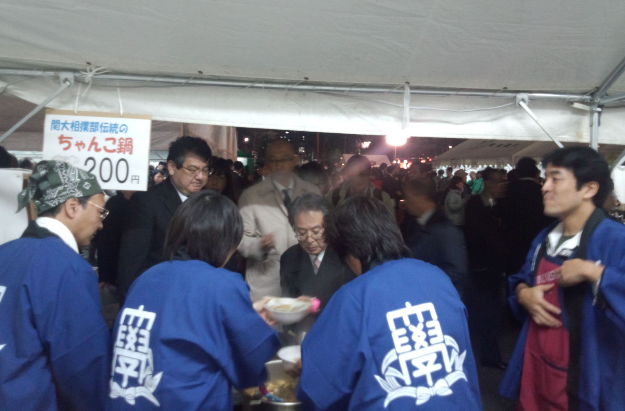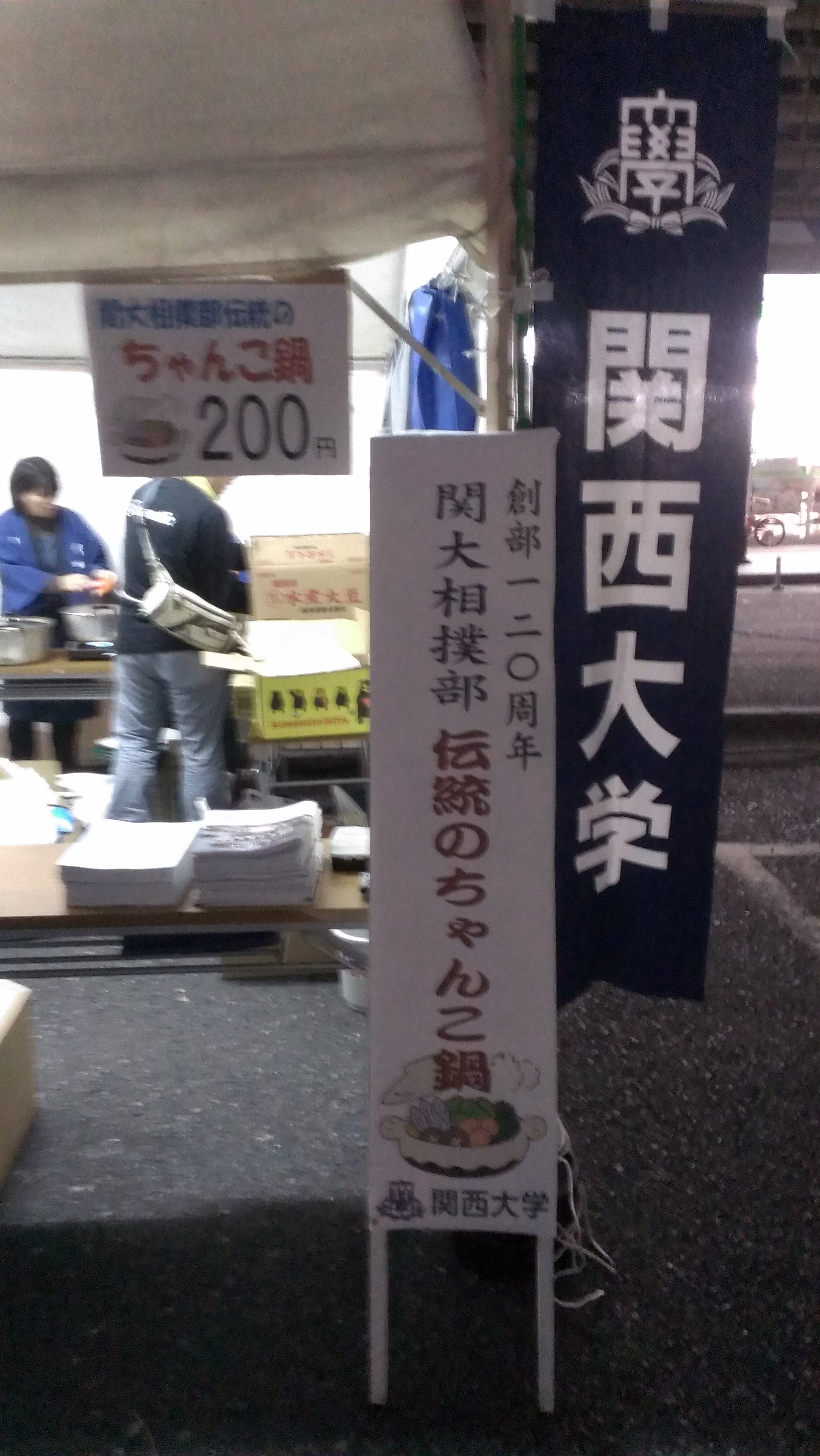会場入りしたのは、午後5時半。販売開始時刻まで30分しかない。先乗り隊の仕事を終えた若手が関大の看板・幟等の設置を既に終えていた。ガスコンロ、鍋、水、具材、箸、容器、調理 ...... やることが多過ぎる。急げ、急げ!