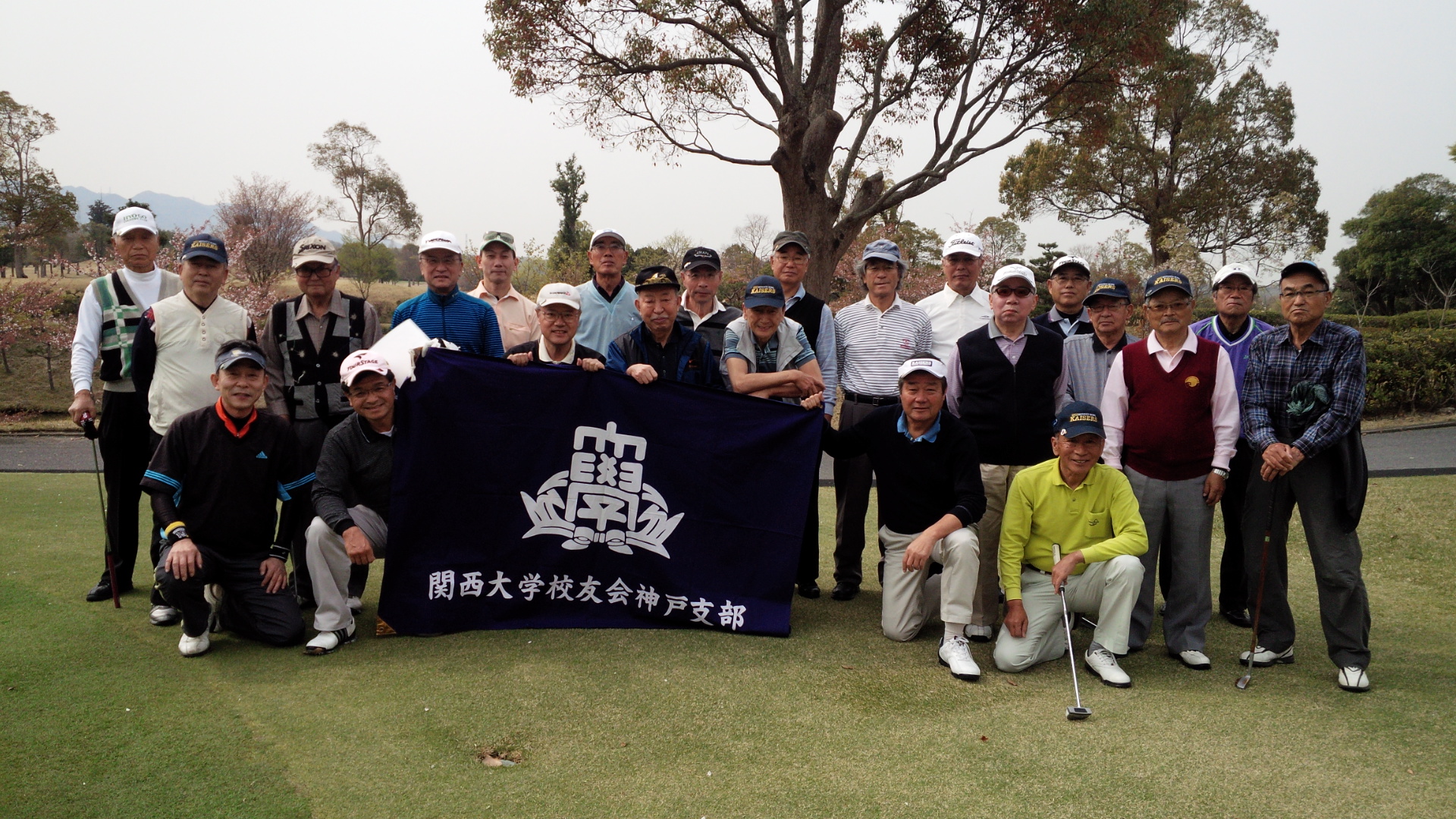 神戸支部(齋藤富雄支部長)の親睦ゴルフ大会が4月16日(水)に三木市の名門、オリムピックゴルフ倶楽部で開催され、初参加の桑村譲氏(昭37法)、藤原進氏(昭42法)の2名を迎え、総勢23人が集った。好天に恵まれて初夏を思わせる陽気の中、親睦を深め、またいつもながら珍プレー、好プレーが続出し、和気あいあいのうちにホールアウトした。