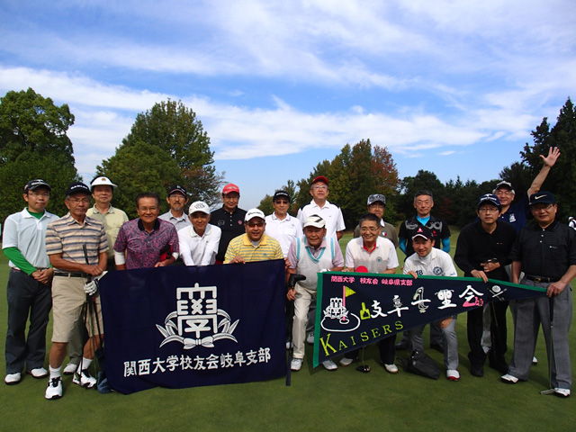 岐阜県の在住・在勤の校友が集う岐阜千里会(松村 公夫 会長)では、傘下のゴルフ部会(小林 四郎 部会長)が、10月11日(土)に岐阜関カントリー西コースにて、第20回の記念ゴルフコンペを開催した。当日は秋晴れの好天のもと、昭和37年卒から平成7年卒までのOB19名が参加し、記念大会に相応しい好プレーが続出した。