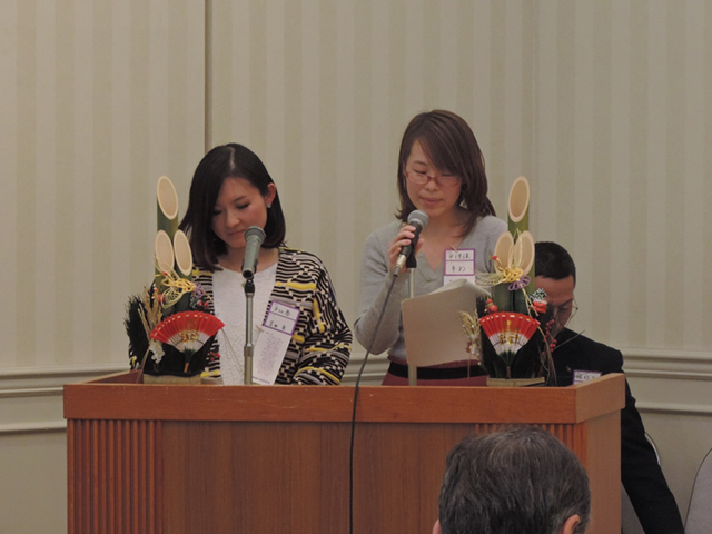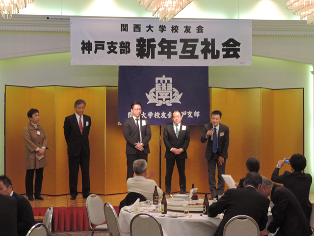 曽輪沙耶加さん(平19法、神戸国際協力交流センター)と吉田朱幹事(平22商、神戸国際協力交流センター)の司会で開会。佐藤一郎副支部長(57法、神戸市役所関大倶楽部会長、神戸市産業振興局長)の開会のことばの後、学歌を斉唱。挨拶に立った織戸支部長(49法、神戸新聞社代表取締役専務)は、過去のひつじ年の紹介と神戸支部の事業運営を担う進行、司会、受付、記録担当の若い人たちを一人ひとり紹介し感謝を表した。
