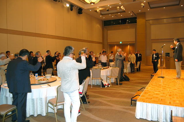 応援団OBのリードで、母校「関大」への想いを馳せ、全員で逍遙歌を大合唱。津留正美先輩(昭32)の万歳三唱で閉宴し、再会を約して散会した。