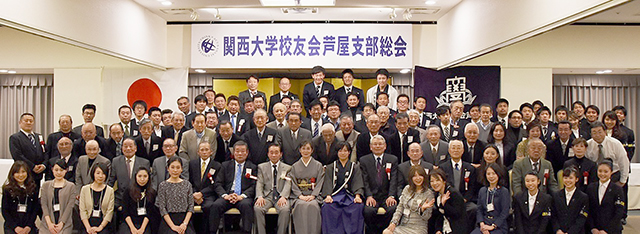 2月6日、芦屋支部(直林法廣支部長)は市内のホテル竹園で総会を開催し、来賓と支部校友総勢93人が参加した。