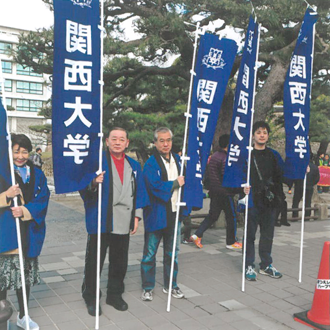 関西大学からは、石川愛海(文2)・北田朋巳(人1)・清水惇子(社3)・髙野涼夏(人1)がエントリーし、松江千里会(神庭民生会長)からも応援に駆けつけ、スタート地点と中間地点の2ヶ所に分かれて応援した。