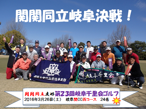 3月26日、岐阜千里会(松村公夫会長)は、岐阜県下の関西学院大・同志社大・立命館大のOB会と関大愛知支部の皆さんをお迎えし、第23回ゴルフコンペを6組24人で開催した。