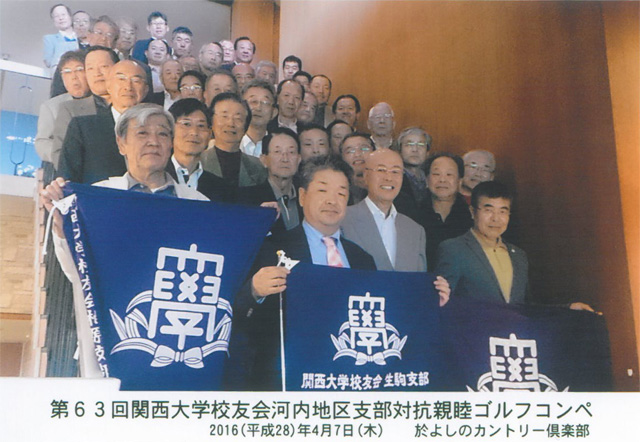 4月7日、悪天候にもかかわらず生駒支部(藤俊弘支部長)主催で、第63回河内近隣支部ゴルフコンペを、母校創立130周年ということもあり、河内近隣8支部と特別に4支部から参加いただき、計12支部総勢41人でよしのカントリー倶楽部で開催した。