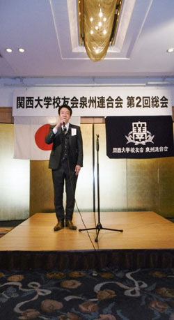 記念写真撮影の後、中村修校友会事務局次長の挨拶・乾杯の発声で第2部懇親会を開催。各支部長の5分間スピーチでは、支部メンバーの紹介もあり盛り上がった。とりわけ、青年部発足2年の和泉支部の平成卒のパワフルな青年部長、淵本英樹副支部長(平5経・写真)の登壇は、連合会にとっても非常に明るいニュースとなった。