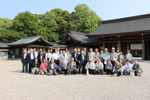 午後は、初代神武天皇を祭神とする橿原神宮へ。篤信家として知られる寺内俊太郎校友会長の根回しで、神職に先導されて内拝殿に参内。神官のお祓いを受け、畑下名誉理事長、中野相談役、児玉理事長が代表して玉串を奉奠、神宮の来歴等を拝聴の後、お神酒をいただいて、厳粛に正式参拝の儀を終えた。 (藤本道人)