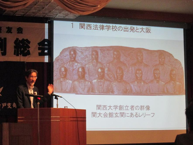 母校創立130周年を記念し、関西大学名誉教授・兵庫県立歴史博物館長の藪田貫先生による「大阪に生まれて‐関西大学創立130年を祝う」のテーマで講演が行われ、支部会員並びに来賓の方々も拝聴し、大阪に地縁の無い中で奮闘した先人の苦労に触れ、母校の歴史にあらためて感銘を受けた。