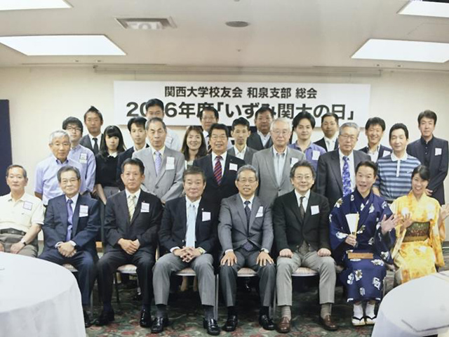 6月4日、ホテルレイクアルスターアルザ泉大津で和泉支部(杉田通雄支部長)総会が開催され、来賓の渡邊泰之校友会副会長はじめ総勢28人が出席した。特に今年は、新たに平成25年卒業のメンバーが2人加入し、活気溢れる総会になった。