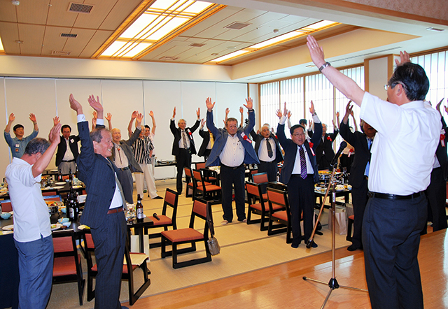畑勝美校友会事務局次長の発声による乾杯の後、歓談の花が咲き、途中、久合田均会員のハーモニカ演奏等を挟みながら宴が盛り上がる中、小山英二会員の口上とリードで逍遙歌合唱、平野斉会員(副市長)の万歳三唱で別れを惜しみつつお開きとなった。
