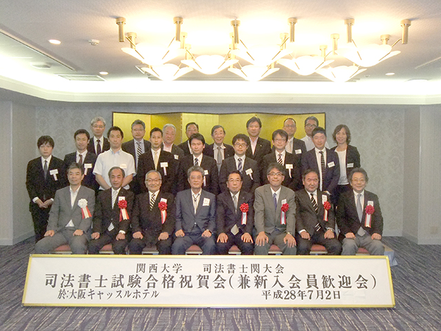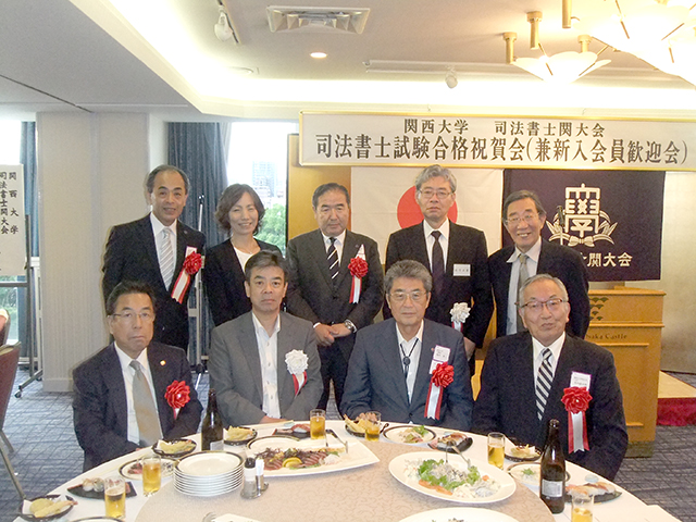 関西大学と司法書士関大会(中村博会長)共催の司法書士試験合格祝賀会(兼新入会員歓迎会)が、7月2日に大阪キャッスルホテルで、大学から池内啓三理事長、楠見晴重学長、葛原力三法学部長、校友会から寺内俊太郎会長らを来賓に迎えるとともに、27年度合格者7人と会員を合わせ総勢53人の参加を得て開催された。