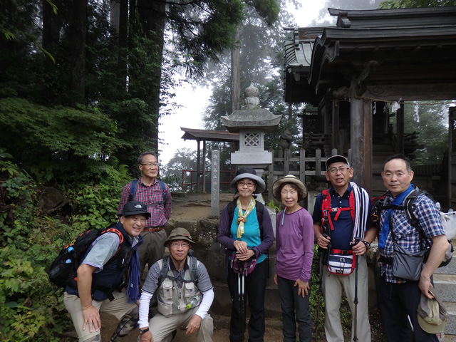 標高差423・6m、最大勾配斜度25度の急勾配を約6分、ケーブルカーで御岳山駅まで上がる。準備体操をしながら当日の体調に合わせて歩行順等を決め、9時55分登頂開始。宿坊を横目に舗装された参道を歩くこと30分、頂上の御岳山神社に参拝。雨は降らないが曇りで視界が悪いため、長尾平展望台はカットして、一路日の出山を目指す。