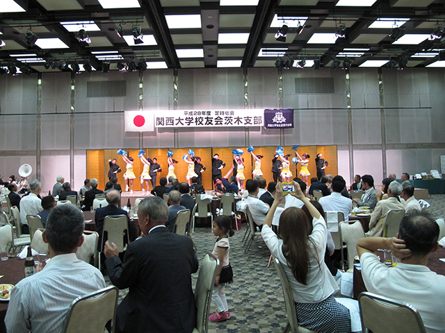 茨木支部(別處了一支部長)の28年度定時総会が、8月4日にホテル阪急エキスポパーク オービットホールで、池内啓三関西大学理事長、田中義昭校友会副会長、福岡洋一茨木市長はじめ多くの来賓と、現役の応援団、リーダー・チアリーダー・吹奏楽を迎え、140人を超える校友の参加の下、盛大に開催された。