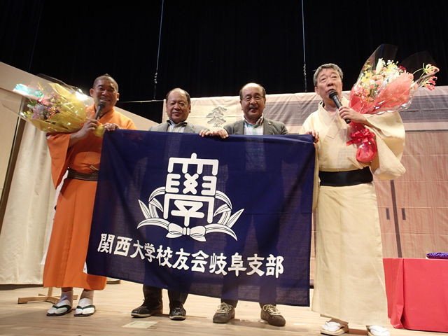大トリの鶴光師匠の落語が終わったところで、主催者と鶴光師匠の厚意により舞台上で岐阜千里会からの花束贈呈を行うことができ、鶴光師匠には松村会長から、染太さんには桑畑幹事から花束の贈呈を行った。また、ステージ上に支部旗を持参して記念写真撮影を行うなど、大いに関西大学をPRすることもできた。