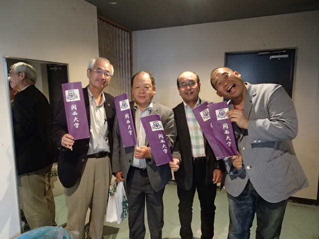 岐阜千里会からは、松村公夫会長(50工)・桑畑昌彦幹事(54経)・前畑忠憲幹事(55経)の3人が会場の大ホール最前列に陣取り、染太さんの出番になると、お手製の「関大幟旗」を振り、『染太!』の掛け声を連呼して、「関西大学校友会岐阜支部」の旗を掲げた。そして、染太さんの新作落語はとても面白く、会場は爆笑の渦に包まれた、