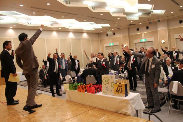 丸岡副支部長の発声で乾杯を行い、懇親会に入った。卒業年次ごとのテーブルでしばし歓談。宴もたけなわ、応援団による勇壮な演舞演奏が披露され、かつての学生生活に思いを馳せるとともに、母校の益々の発展を祈った。最後に出席者全員で輪になり、はるばる金沢市から参加した応援団第81代団長藤井氏の力強いリードで逍遙歌を合唱し、お開きとなった。