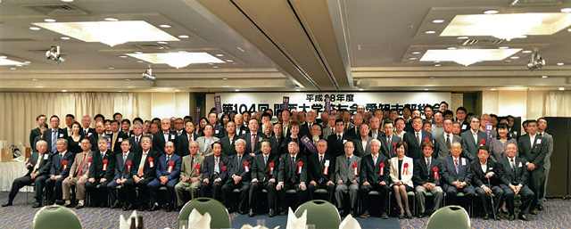 愛知支部(前田元己支部長)の28年度第104回総会が、10月15日にキャッスルプラザで開かれた。田中義昭校友会副会長、北田伸治常務理事、吉田宗弘副学長はじめ近隣5支部、京都支部、滋賀支部、関西学院大学同窓会名古屋支部からの来賓の出席をいただき、総勢114人の参加となった。今年も平成卒校友が34人(36%)を占め、支部目標の40%が見えてきた総会となった。