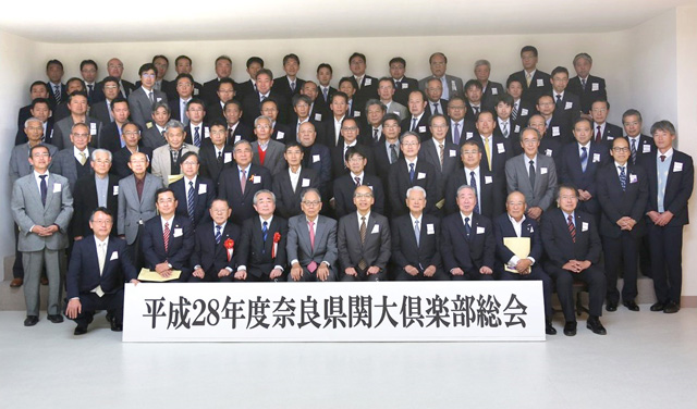 奈良県関大倶楽部(松谷幸和会長)は、11月12日にホテルリガーレ春日野で28年度総会を開催した。来賓として本部から北嶋副会長らをお迎えし、100人が出席する盛会となった。