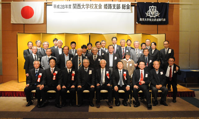 姫路支部(植田芳光支部長)では、28年度総会を11月11日に姫路キャッスルホテルで、田中義昭校友会副会長はじめ近隣支部代表の方々のご出席をいただき、開催することができた。当日は支部会員も昭和32年卒から平成26年卒までの37人に出席いただいた。