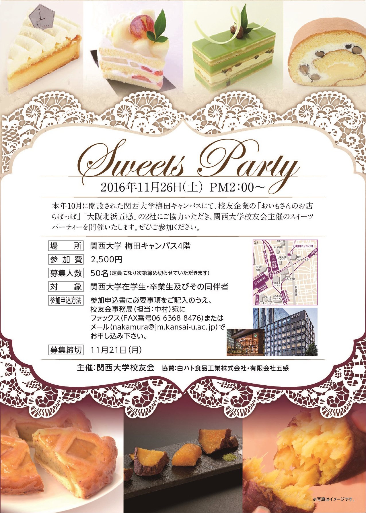 11月26日(土)午後2時より、校友会主催のスイーツパーティを開催いたします。校友企業の「おいもさんのお店 らぽっぽ」と「大阪北浜五感」の2社にご協力いただきます。下記またはチラシをご確認の上、ぜひご参加いただければと存じます。多くの校友の皆様のご参加をお待ちしております。
