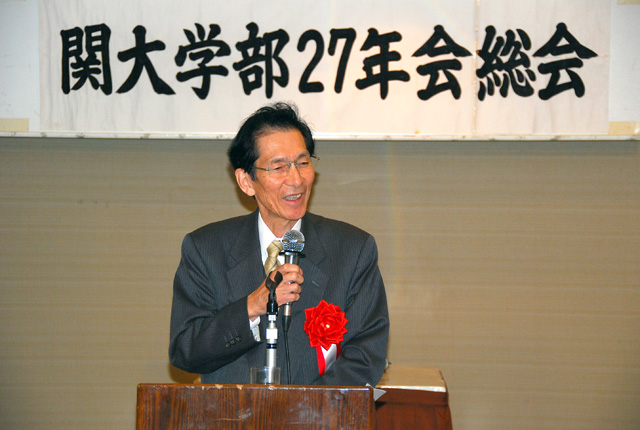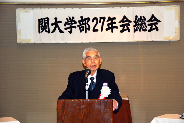 本日の講師・宮本勝浩名誉教授は国際経済論の大家・経済効果の元祖というべき先生と、校友会の渡邊泰之副会長、東郷洋事務局長を来賓に迎え、学歌斉唱、物故者への黙祷、畑下会長挨拶に始まり、中野英満副会長を議長に事業報告・会計報告を審議、異議なく了承され、総会を終了した。