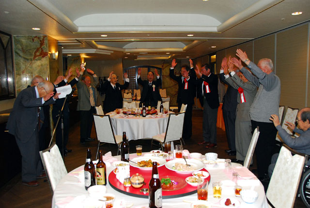 一同で記念写真を撮り、別室に移り宴会が始まった。各テーブル毎の紹介のあと、本人のスピーチを順次行って近親感を広げ、逍遙歌を歌い、万歳を三唱、会員の健康を願い、春のスプリングフェスティバルの協賛家族会と秋の総会へ、是非元気で出席をと願って散会した。
