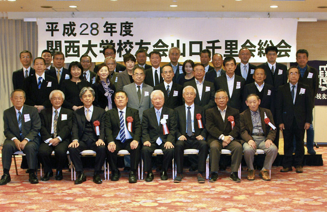山口千里会(藤井宏紀会長)28年度総会は、11月12日に例年どおりJR新山口駅前の山口グランドホテルで、本部から田中義昭副会長はじめ近隣支部から福岡千里会宮津和宏副会長、広島支部岡本直久副支部長、北九州支部大石義雄副支部長らにも出席いただき、当日体調不良等で欠席者が数名あったものの校友29人、来賓5人の出席のもとに開催された。