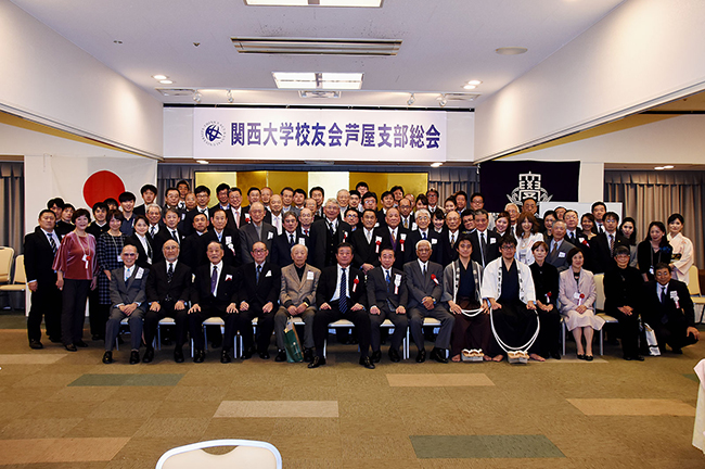 芦屋支部(直林法廣支部長)の29年度総会が、2月4日にホテル竹園で開催され、男性67人・女性15人の計82人(うち昭和卒55人、平成卒・平成入学生27人)が一堂に会した。