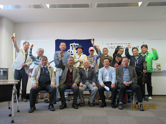 井藤幹事長の司会進行で、南畑支部長の挨拶に続き、徳野相談役、重里会計部長、田中勇治副支部長さん...等々、参加者挨拶や自己紹介のあと、重里さんの軽音楽グループ「ブルーグラス」の皆さんによるギター演奏で盛り上がりました。