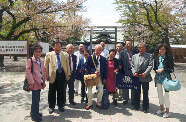 住吉支部(小林洋司支部長)では、第4回ツアーとして4月15日、校友会の田中義信副会長・三木充子監事をはじめ近隣支部の役員の方々にも参加いただき、寺内俊太郎会長のお計らいで靖国神社昇殿参拝(正式参拝)を果たす事ができた。