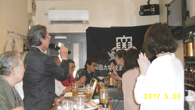 学歌流れる会場に集合。最初に全員で学歌斉唱のあと、西出弘秋「カラオケ友の会」部会長挨拶では、幹事会(飯島明幹事・吉田常佳顧問・松浪啓一副顧問)の紹介があり、「生きがいを育む」「親睦を深める」「決してプロの歌手を目指さない」「なんで歌手になれへんの?と言われること」という会の趣旨の説明があった。