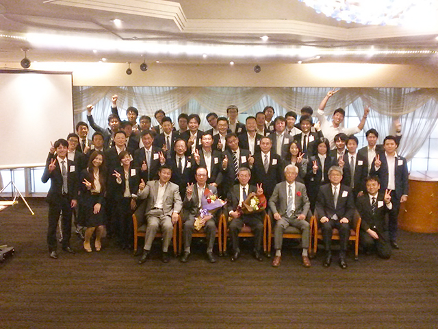 宴の最後に、この春までに定年を迎えられた金子政晃さん(54建)、佐藤忠司さん(49土)のお祝いに、後輩を代表して東野春奈さん(平26商)、岩田彩さん(平21社)から花束を贈呈、参加者全員で祝った。