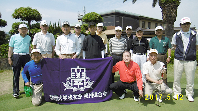 5月12日、快晴の関空クラシックゴルフ倶楽部、学歌流れるパター練習グリーンにメンバー全員集合。泉州連合会(吉田常佳会長)第5回ゴルフコンペが開催された。