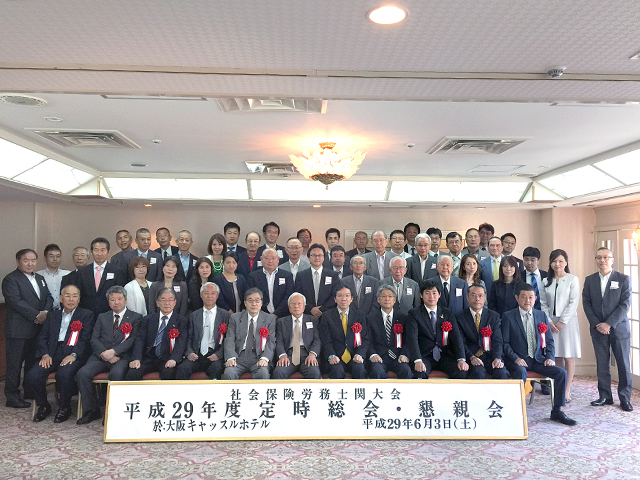 6月3日、天満橋の大阪キャッスルホテルで、会員43人参加のもと社会保険労務士関大会(田中義久会長)29年度定時総会が開催されました。
