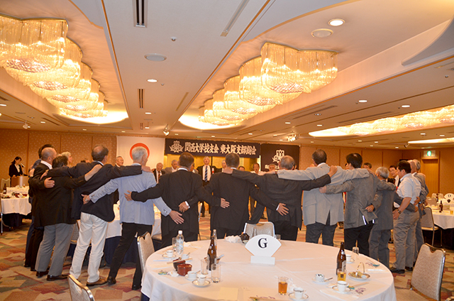 在間副支部長の閉宴の辞の後、最後に全員で肩を組んで円陣となり、来年もまた元気な顔を見せ合うことを約し、太田応援団長の指揮で、逍遙歌を声高らかに吟じ、過ぎし青春の日々に思いを馳せながら散会となった。