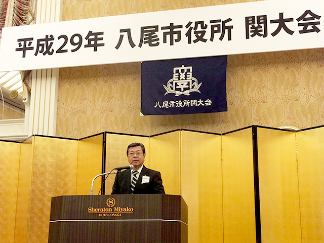 来賓挨拶で、八尾支部が平成24年の市役所関大会総会に初めて出席して相互交流を始めて以来、今年で6年目に入り新たな交流を目指そうと出席者に呼びかけた。