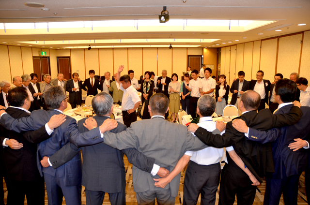 最後は、円陣を組み、応援団OBの演舞に合せて、母校「関大」への想いを馳せ、全員で逍遙歌を大合唱した。杉山泰司先輩(49学経)の肥後の一本締めで閉会し、再会を期して散会した。