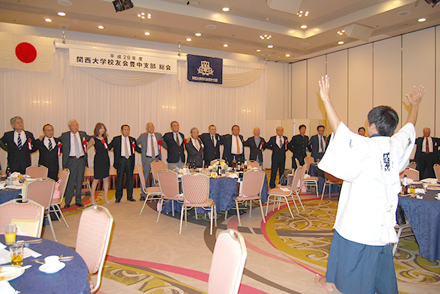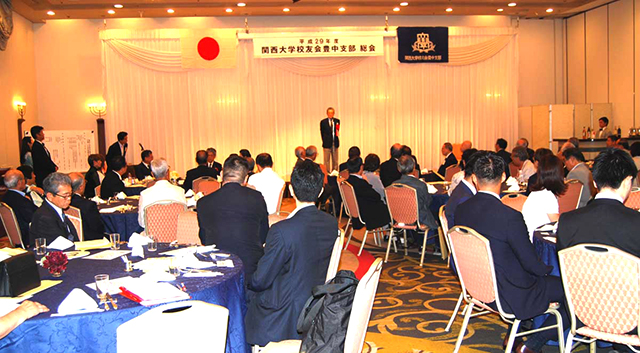 豊中支部(上村学支部長)の29年度総会が、9月23日に千里阪急ホテルで開催された。当日は大学から池内理事長、芝井学長、校友会から田中副会長をはじめ、近隣支部の支部長、役員を来賓に迎え、同伴者を含めて70人の参加となった。