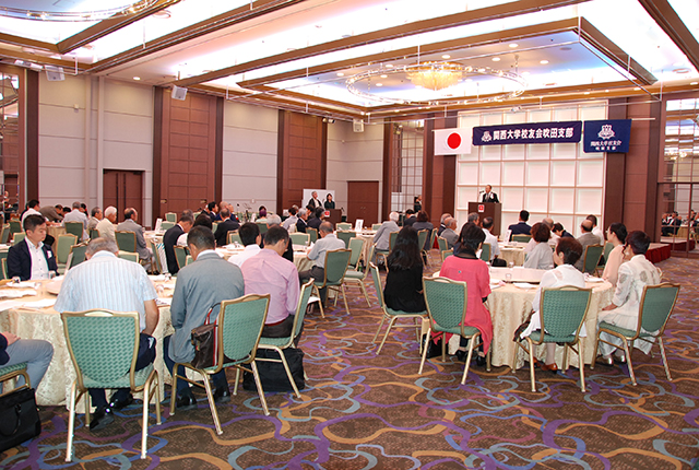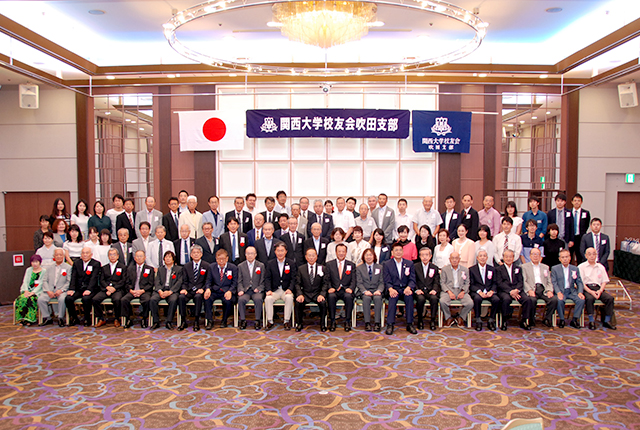 吹田支部(谷康司支部長)29年度総会は、9月9日に江坂駅前の東急REIホテルで開催され、田中義信校友会副会長、北田伸治法人常務理事、高増明副学長、後藤圭二吹田市長はじめ、近隣各支部の代表など多数の来賓と吹田市役所関大会、会員の総勢90人が出席した。
