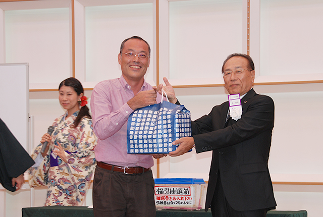 藤本夫妻と小川将史副幹事長の絶妙なやりとりで、会場は一気に盛り上がり、8等の高級ウルメ丸干(市価2,000円)から特等高級海産物6点セット(市価23,500円)まで、当選番号発表の度に歓声が上がった。
