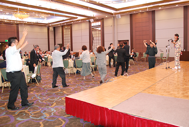 興奮冷めやらぬ中、司会の藤本真希さんから沖縄民謡の披露があり、中にはテーブルを立って踊りだす会員も見られた。藤田由典応援団第79代団長のリードで逍遙歌を大合唱、吹田市役所関大会・大山達也秘書長の発声で万歳を三唱し、藤原輝之副支部長の閉宴の言葉で、心地よい余韻を含んだお開きとなった。
