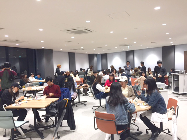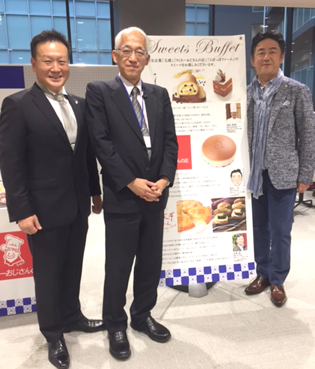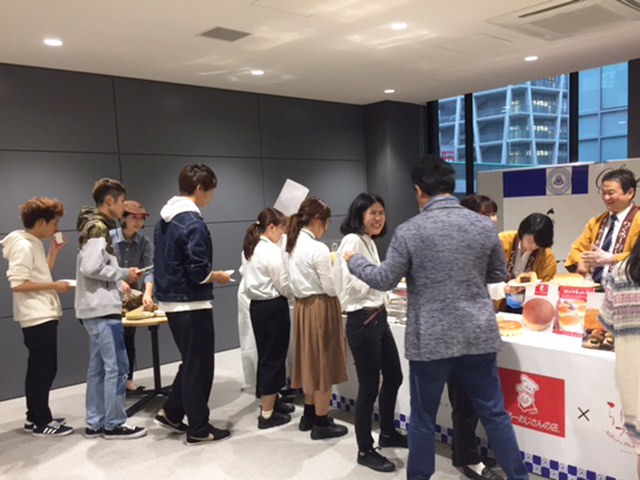 中でも、この日一番の盛り上がりを見せたのが、4階で行われた「スイーツフェス」。校友企業であり、関西スイーツ界を代表する「五感」「りくろーおじさんの店」「らぽっぽファーム」の3社の協力による大試食会に、学生たちも一様に大喜び!当日駆け付けた白ハト食品工業㈱(らぽっぽファーム)の永尾俊一社長、五感の浅田美明社長の両トップに加え、芝井学長による即席トークも展開され、多様な世界で活躍する関大人のパワーを、多くの現役学生が「美味しく」体験した。