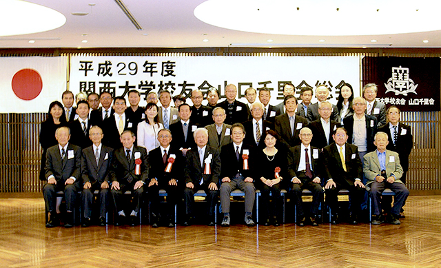 山口千里会(藤井宏紀会長)29年度総会は、11月11日にJR新山口駅前の山口グランドホテルで、本部から東郷洋参与、近隣支部から福岡千里会渡辺美敏副会長、広島支部山下孝子支部長、北九州支部大石義雄副会長の4人にご出席いただき、校友36人の出席のもとに開催された。