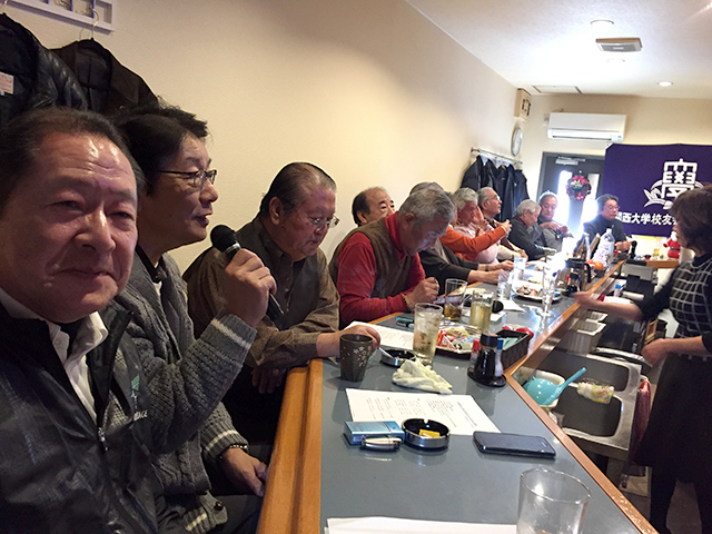 学歌流れる会場。最初に全員で学歌斉唱し、吉田顧問挨拶に続き、西出部会長の乾杯の音頭で開会した。