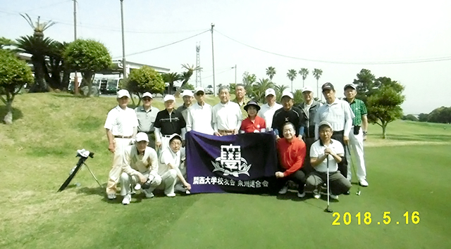 天候に恵まれた岬カントリークラブ、学歌流れるパターグリーンにメンバー全員集合。5支部計5組17人の参加を得て、5月16日に泉州連合会(吉田常佳会長)第8回ゴルフコンペが開催された。