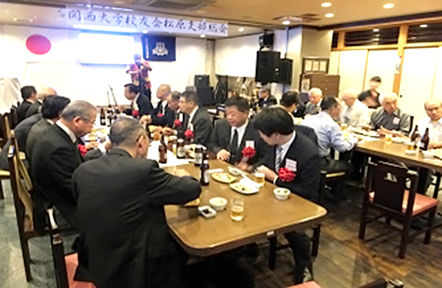 続いて各来賓の紹介において、田中校友会副会長から「関大の現状は少子化の中でも受験生は増えており、学生の40%以上を女性が占め、海外支部も20を超えること。46万人余の校友を擁し、大学の中でも有数な校友会活動がなされている」ことが報告された。そして、現在はグローバル化に向け考えて動く「考動力」「革新力」を関大ビジョン150年として取組んでいることの説明と、天神祭奉拝船「関大丸」、名古屋での「フェスティバルin東海」への参加要請があった。