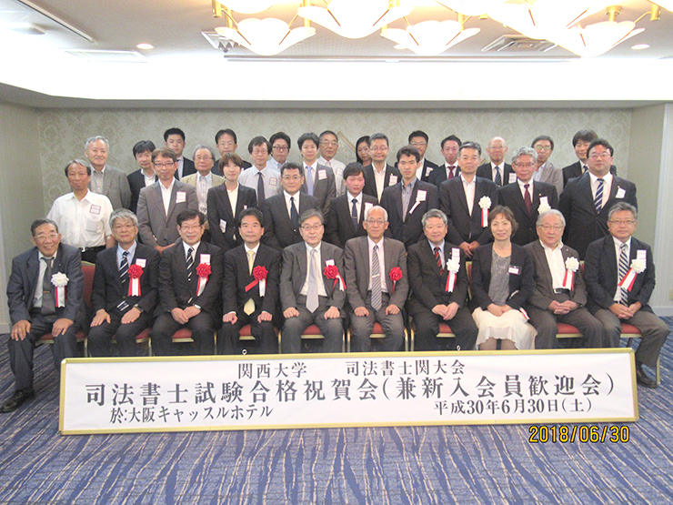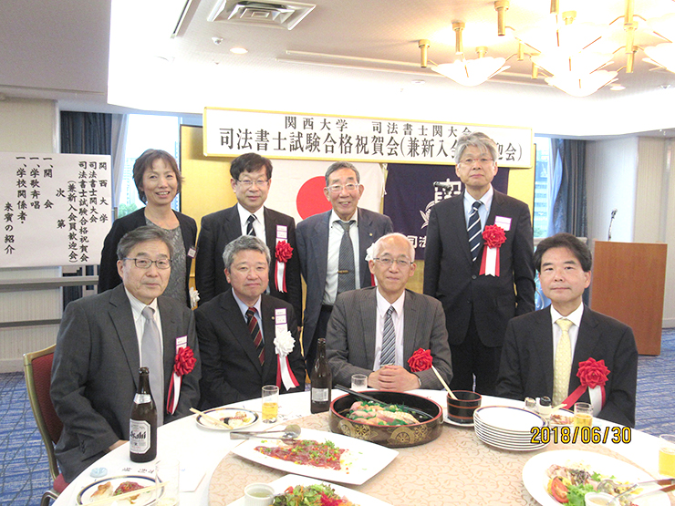 司法書士関大会(中村博会長)の司法書士試験合格祝賀会(兼新入会員歓迎会)が、6月30日に大阪キャッスルホテルで、大学より芝井敬司学長、矢野秀利常務理事、小泉良幸法学部長、校友会より玉置栄一副会長らを来賓に迎えるとともに、平成29年度合格者4人と会員を合わせ総勢37人の参加を得て開催された。