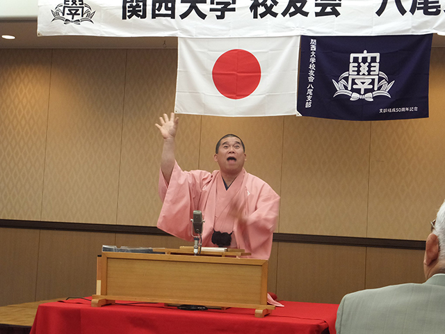 続いて、校友の林家染太師匠の落語を楽しみ、和やかに懇親を重ねた後、逍遙歌を合唱、記念写真撮影をして、万歳三唱でお開きとなった。