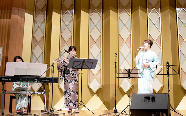 お楽しみの懇親会は、JR四国の観光列車「四国まんなか千年ものがたり」のテーマソング「しあわせのそら」を歌う木内さんのミニコンサートで幕開け。進行を務めた松野安伸校友(51経)とのデュエットもあり、大いに会場を盛り上げてくれた。