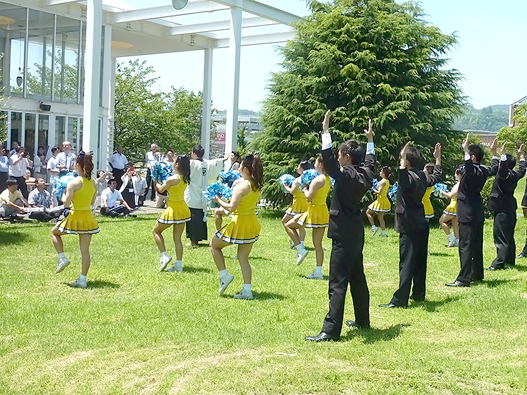 懇親会のメーンイベントは、応援団の演舞です。34℃の猛暑の中、チアリーダーを含む20人が20分間大熱演。校友はスティックバルーンをたたいてお互いに汗だくになりながらも、演舞に大喝采を送りました。
